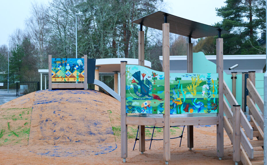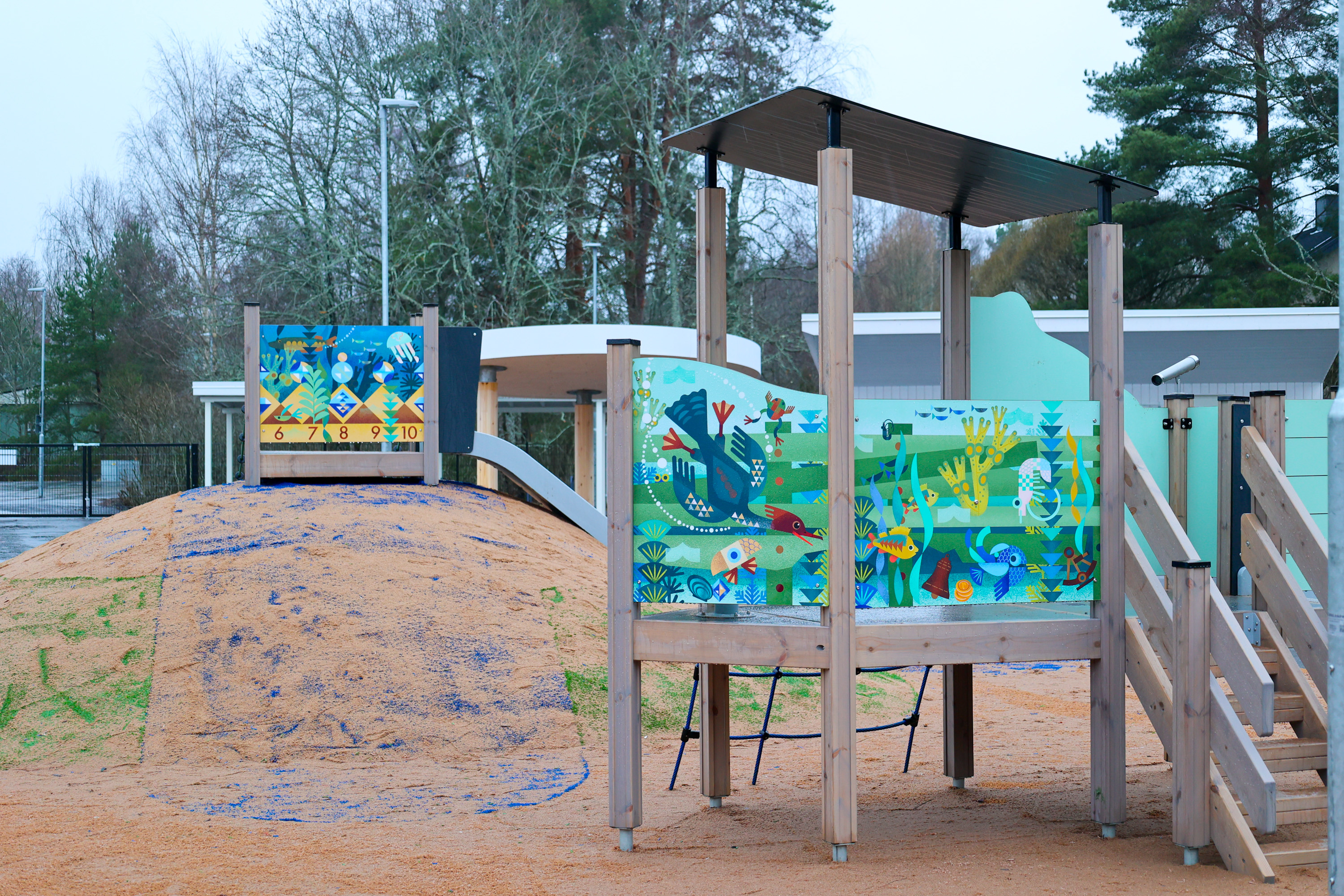 – Kokonaisuus kutsuu mielikuvitusleikkiin Rauman merenkulun historiaan ja saarihyppelylle Selkämeren kansallispuiston tunnelmiin. Pihan taide rakentuu kolmesta teemasta: Pinnan alla sekä Pinnalla ja Rannalla, Jenni Väisänen kertoo.