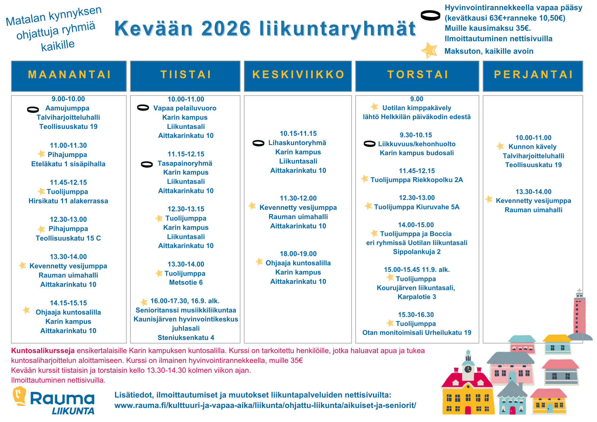 Tähdellä merkittyihin ryhmiin on vapaa pääsy hyvinvointirannekkeella, muille kausimaksu 34,20 €. Kausimaksu maksetaan uimahallin kassalle ja kuitti näytetään ohjaajalle. Vesijumppiin ja kuntosalille maksetaan uimahallin pääsymaksu.