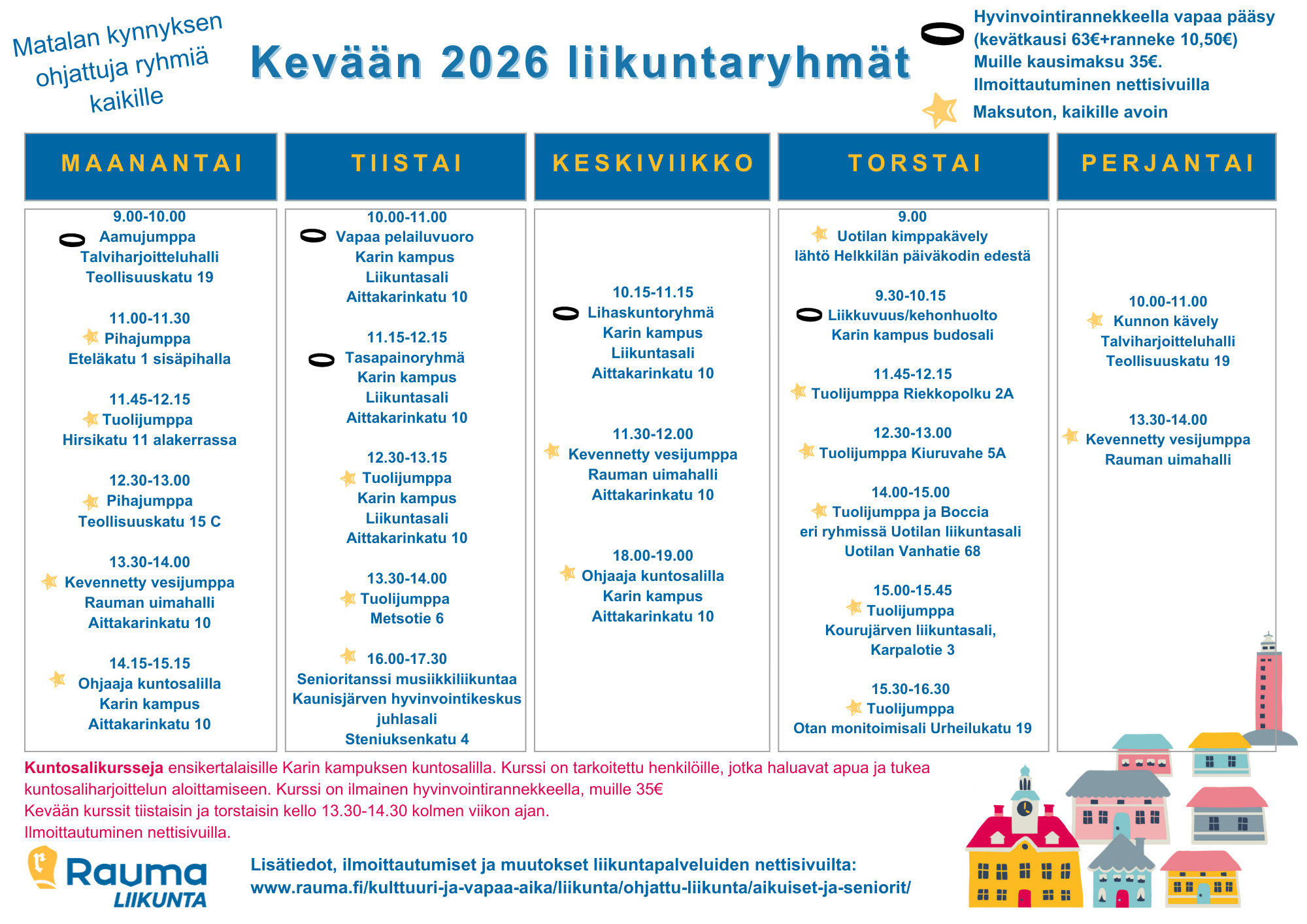 Tähdellä merkittyihin ryhmiin on vapaa pääsy hyvinvointirannekkeella, muille kausimaksu 35 €. Kausimaksu maksetaan uimahallin kassalle ja kuitti näytetään ohjaajalle. Vesijumppiin ja kuntosalille maksetaan uimahallin pääsymaksu.