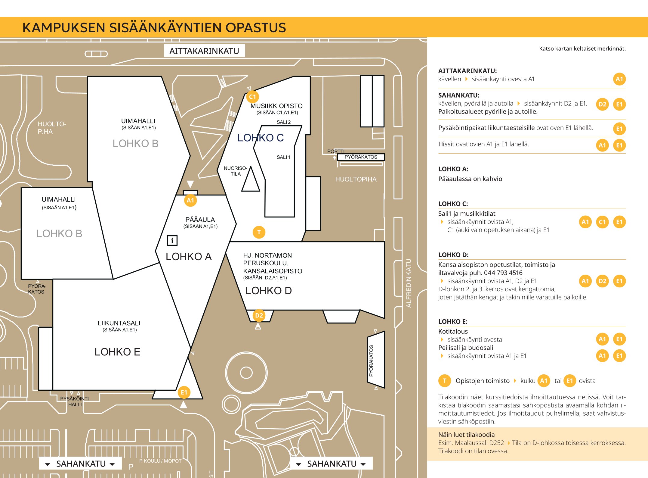 Tervetuloa Karin kampukselle! Oheisesta kuvasta näkee Karin kampuksen sisäänkäyntien opastuksen. Oman kurssisi tilakoodin saat tarkistettua ilmoittautuessa kurssitiedoista. Koodi näkyy myös sähköpostiin tulleesta vahvistusviestistä avaamalla kohdan ”ilmoittautumistiedot”.